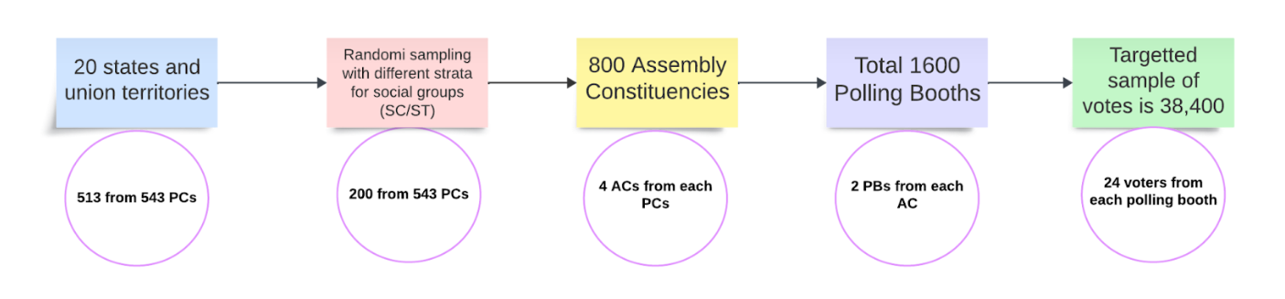 These states are all major states, representing 513 out of 543 parliamentary constituencies in the country. Among the 200 parliamentary constituencies (PCs) sampled, 33 were reserved for Scheduled Castes (SCs) and 16 for Scheduled Tribes (STs). A systematic random sampling with replacement technique was used to select 4 assembly constituencies (ACs) from each of these 200 PCs, resulting in a total of 800 ACs nationwide. In each of these 4 ACs, 2 polling booths (PBs) were randomly selected. From each of those polling booths, 24 respondents were randomly chosen to answer the final questions. Consequently, the survey encompasses approximately 1,600 polling booths and about 38,400 respondents across the country. The following diagram illustrates the sample design of the survey: